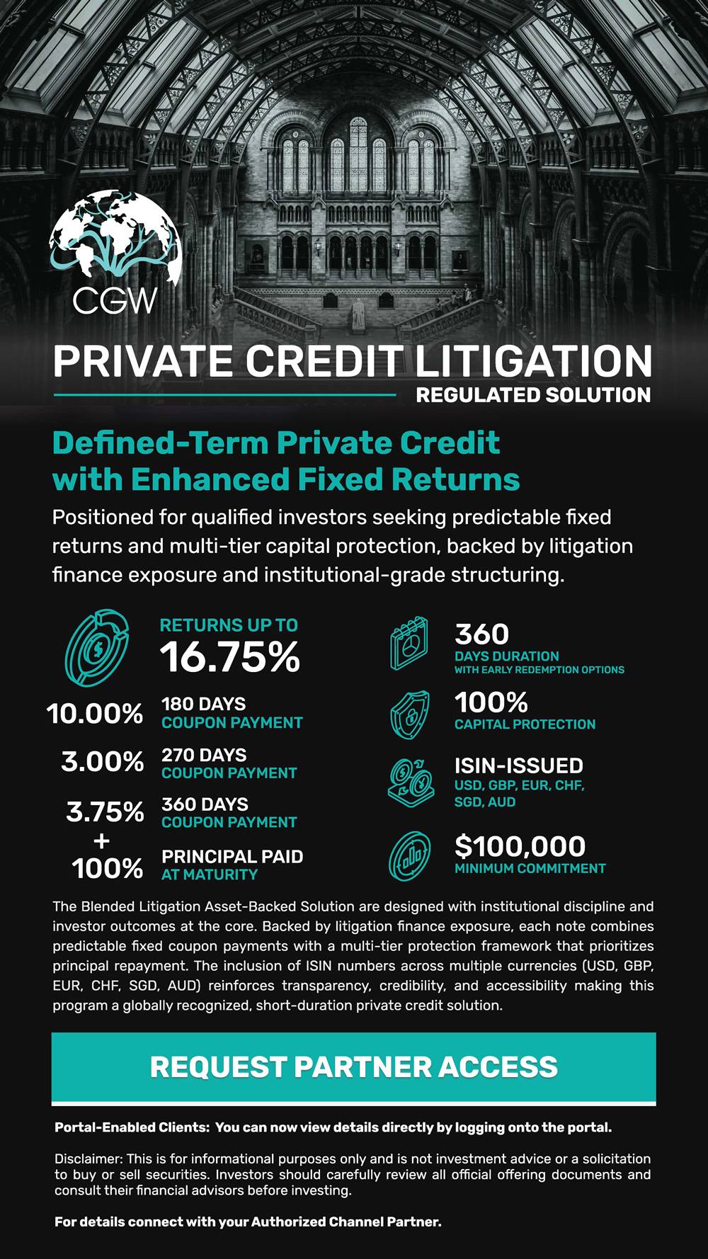 These notes are designed for advisers who want predictable outcomes, short cycles, and full principal protection. They sit on insured private credit and litigation-backed receivables with fixed coupons and clearly defined durations.